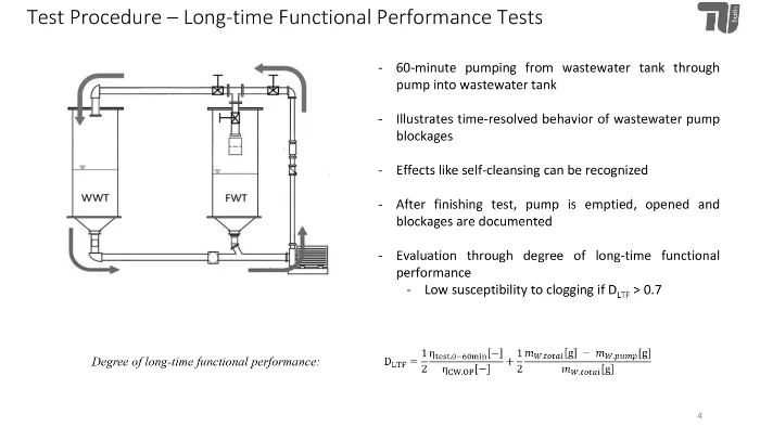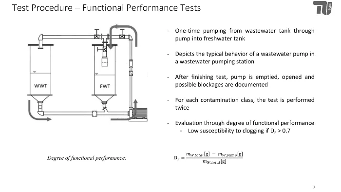 Zur gezielten und quantifizierbaren Bewertung der Funktionsfähigkeit wurde an der Technischen Universität von Prof. Dr. Thamsen der o.g. mehrstufige Pumpenfunktionstest entwickelt, bei dem untersucht wird, inwiefern die getesteten Kreiselpumpen in der Lage sind, feste Abfallstoffe mit unterschiedlichen Verschmutzungsgraden zu fördern, ohne zu verstopfen. Bis heute wurden über 60 verschiedene Laufräder getestet.
